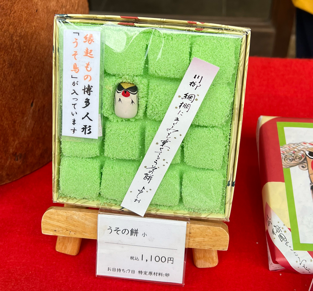“嘘を誠に変えてくれる”という意味の縁起物なのですが、鷽鳥モチーフの鮮やかな緑色の牛皮のお菓子が売っていて、可愛いのでつい手に取りたくなります。