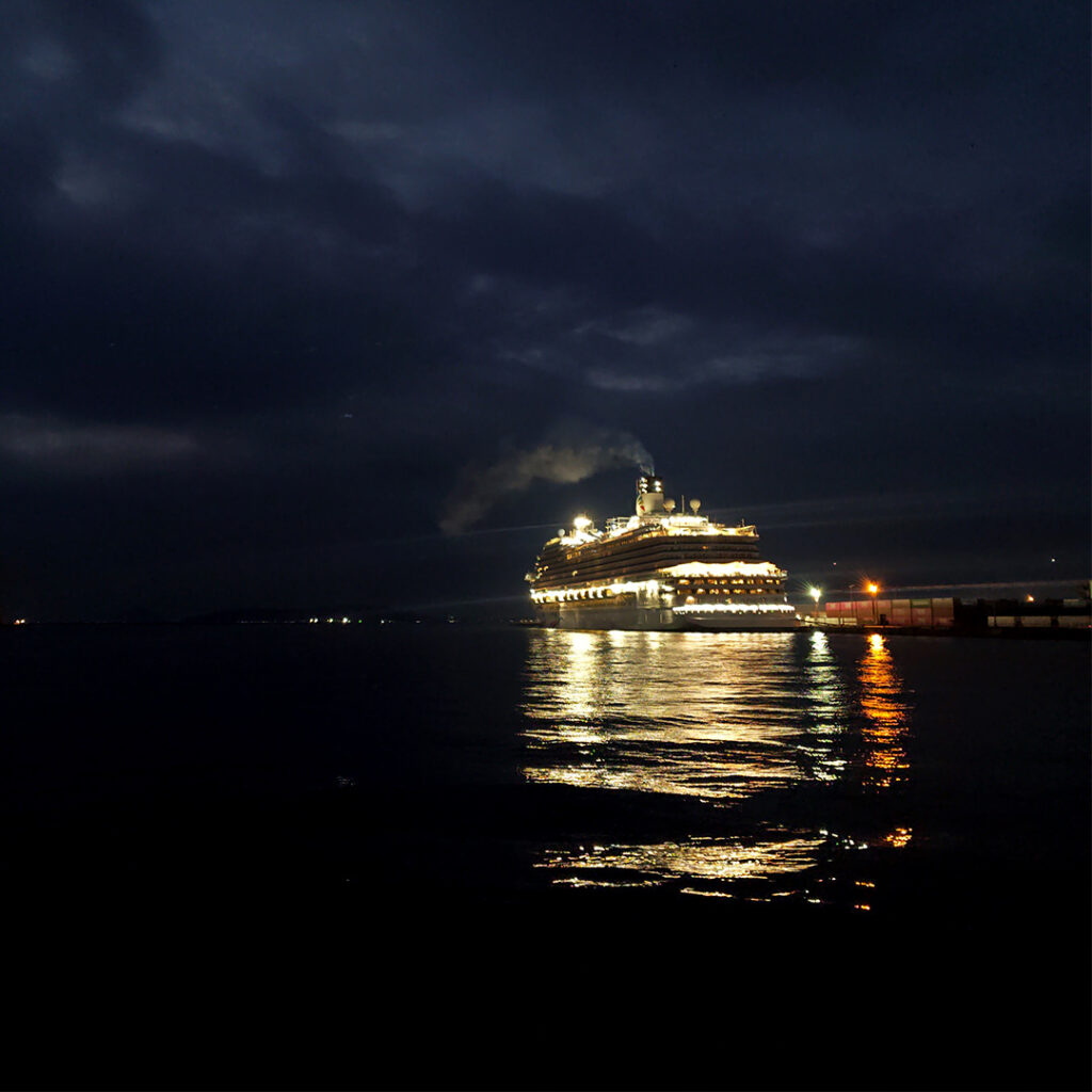 写真じゃわかりにくいですが、豪華客船って感じで…。船には詳しくないので、ただの定期便かもですが。